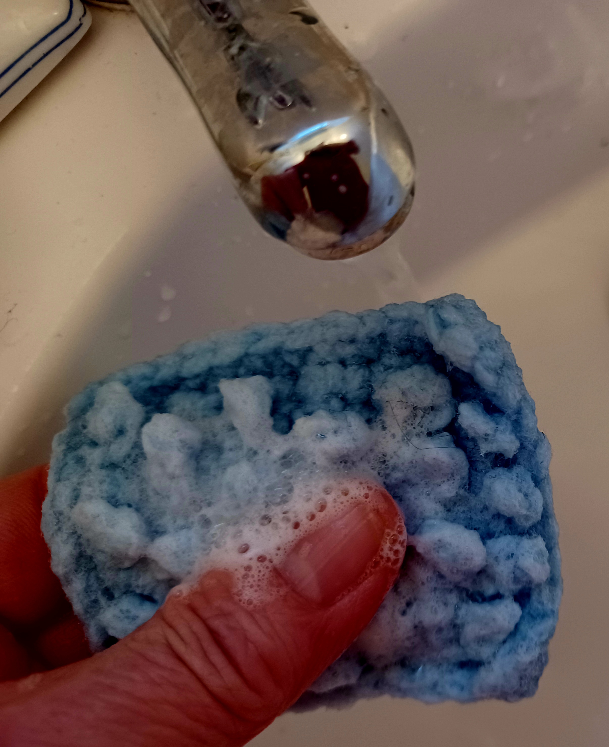 Super fun and quick to make out of yarn remnants. Fill this wee pouch with odd ends of soap and then use for washing. Made using a teeny tiny bobble stitch for texture, and so easy